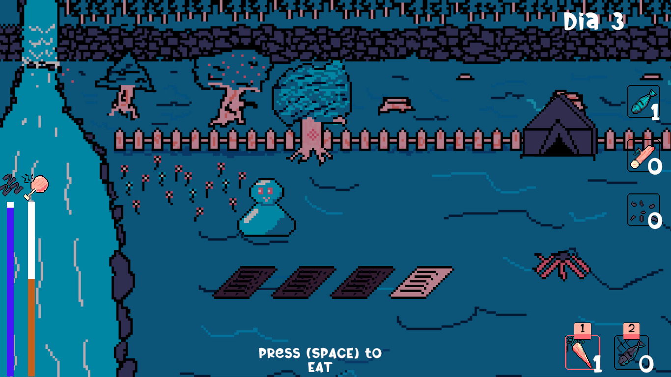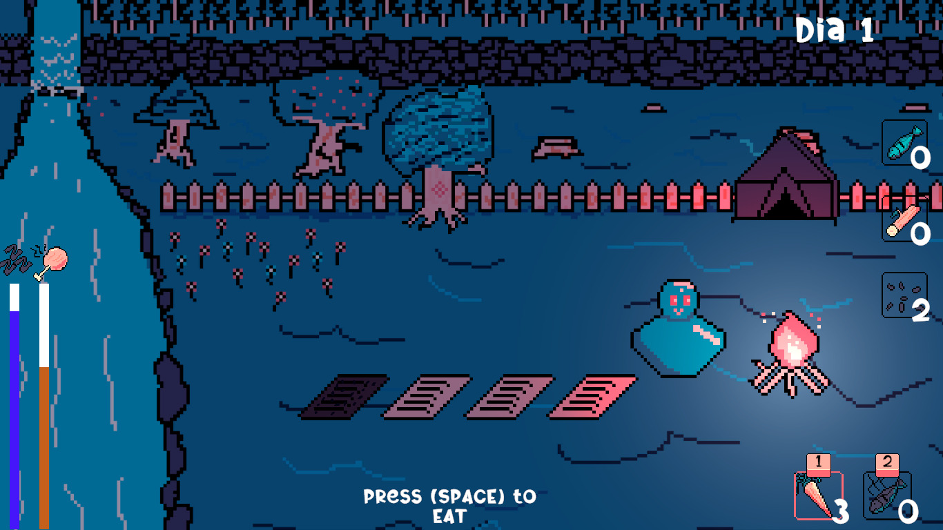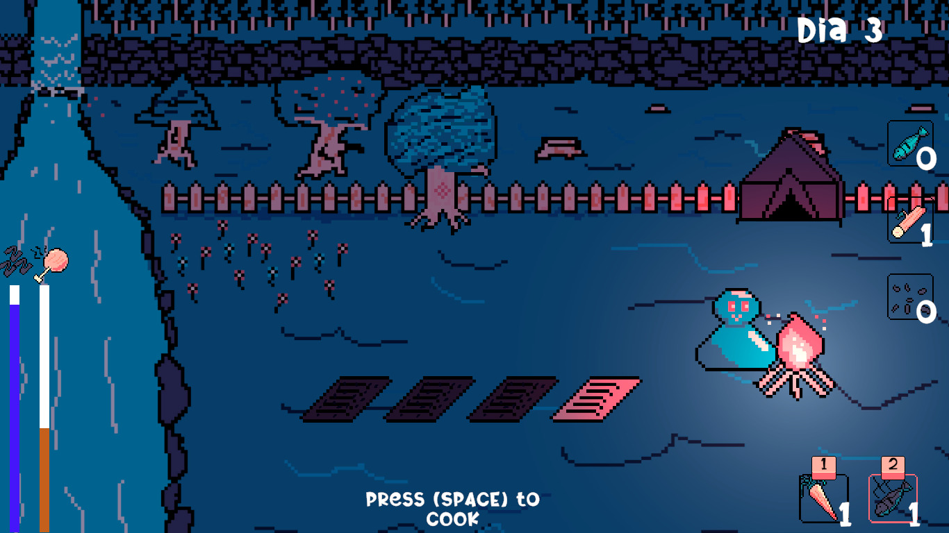 SPACE to interact with the world (Eat, cut tree, plant, harvest, fish, sleep, cook and light fire)